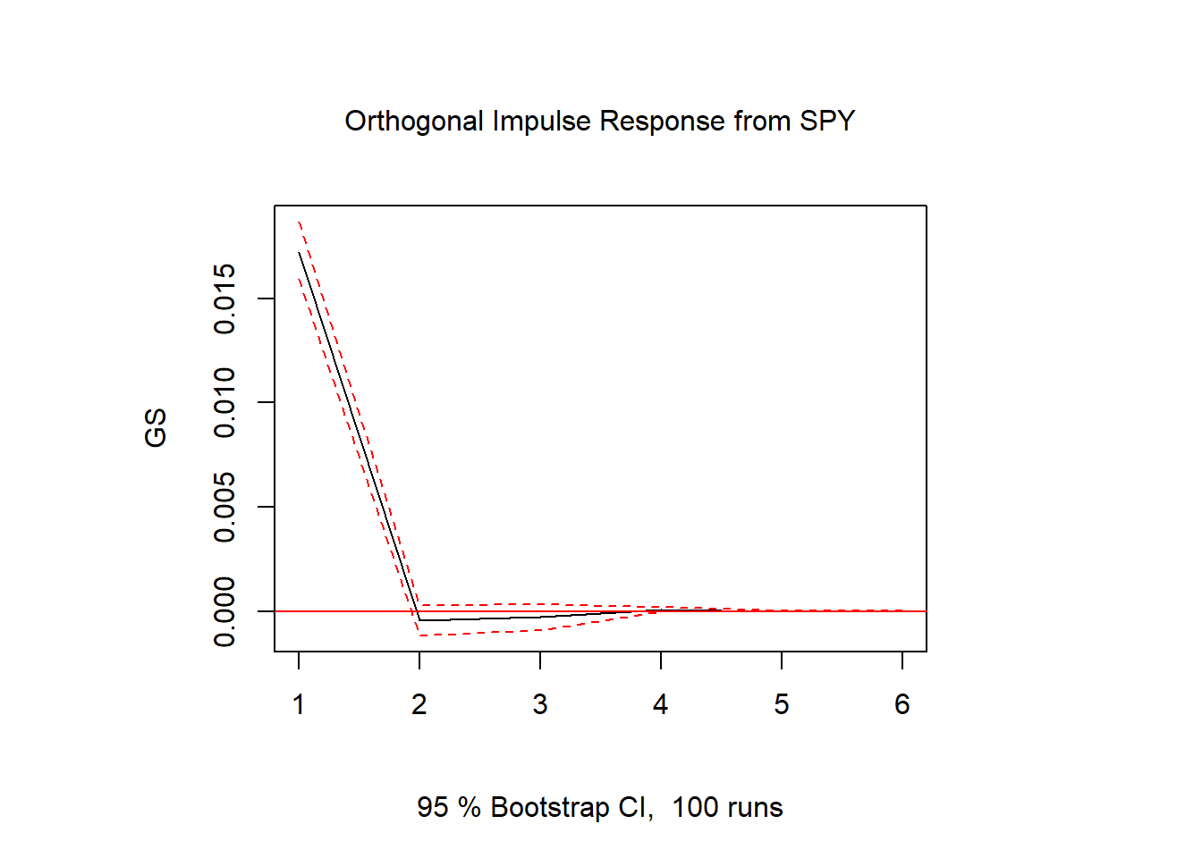 IRF <- irf(var, impulse = 'SPY', response = 'GS', n.ahead = 5, boot = TRUE, runs = 100, ci = 0.95)