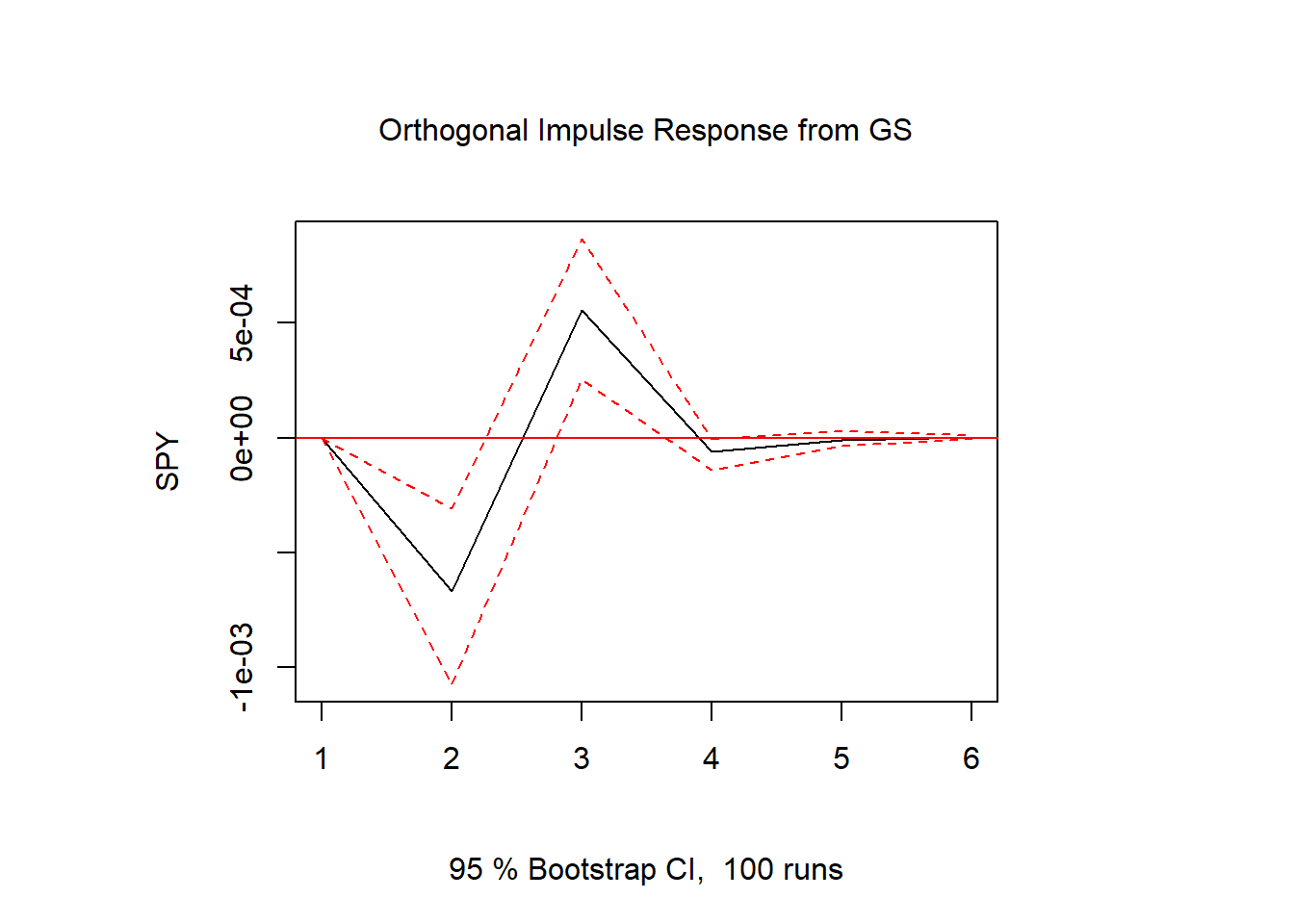 IRF <- irf(var, impulse = 'GS', response = 'SPY', n.ahead = 5, boot = TRUE, runs = 100, ci = 0.95)