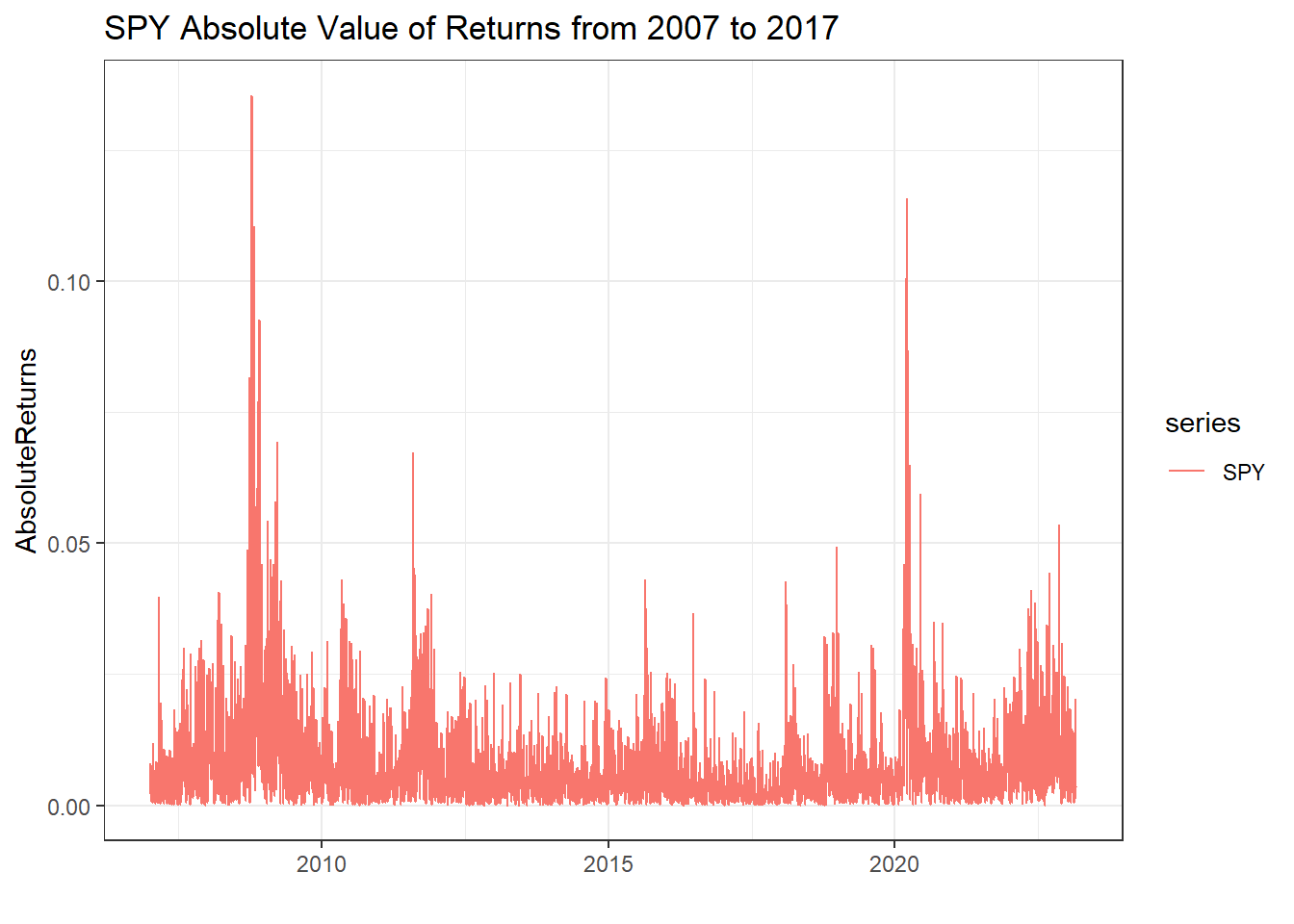 labs(title = "SPY Absolute Value of Returns from 2007 to 2017", x = "")