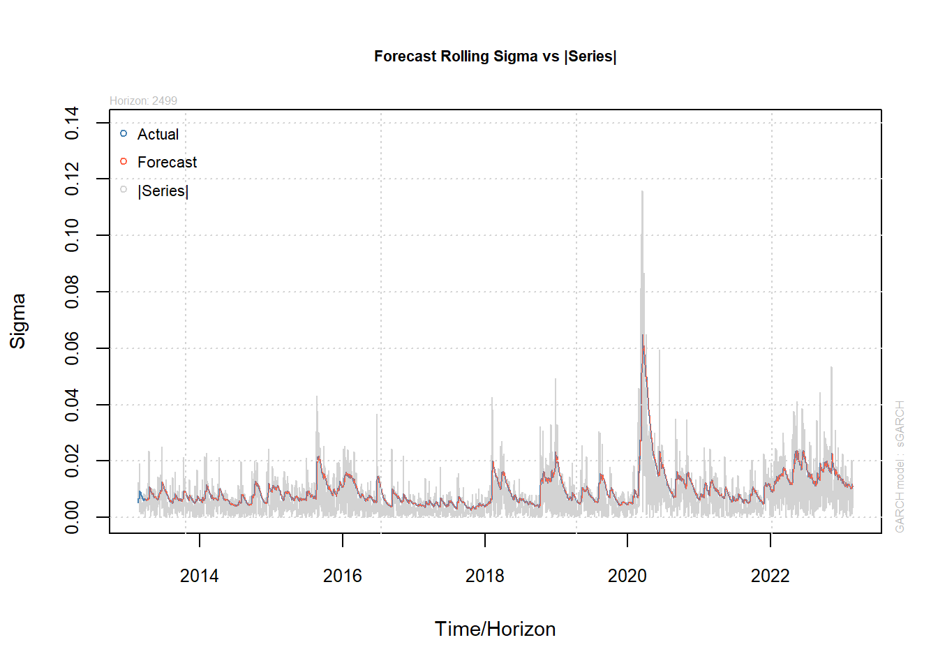Now let’s use the rugarch’s standard functionality to use this estimated model to produce rolling forecasts of \(\sigma_t\) and plot them versus \(\left| r^{SPY}_t \right|\).