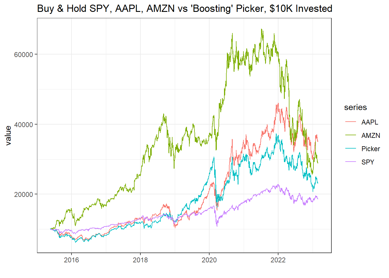 labs(title = "Buy & Hold SPY, AAPL, AMZN vs 'Boosting' Picker, $10K Invested", x = "")